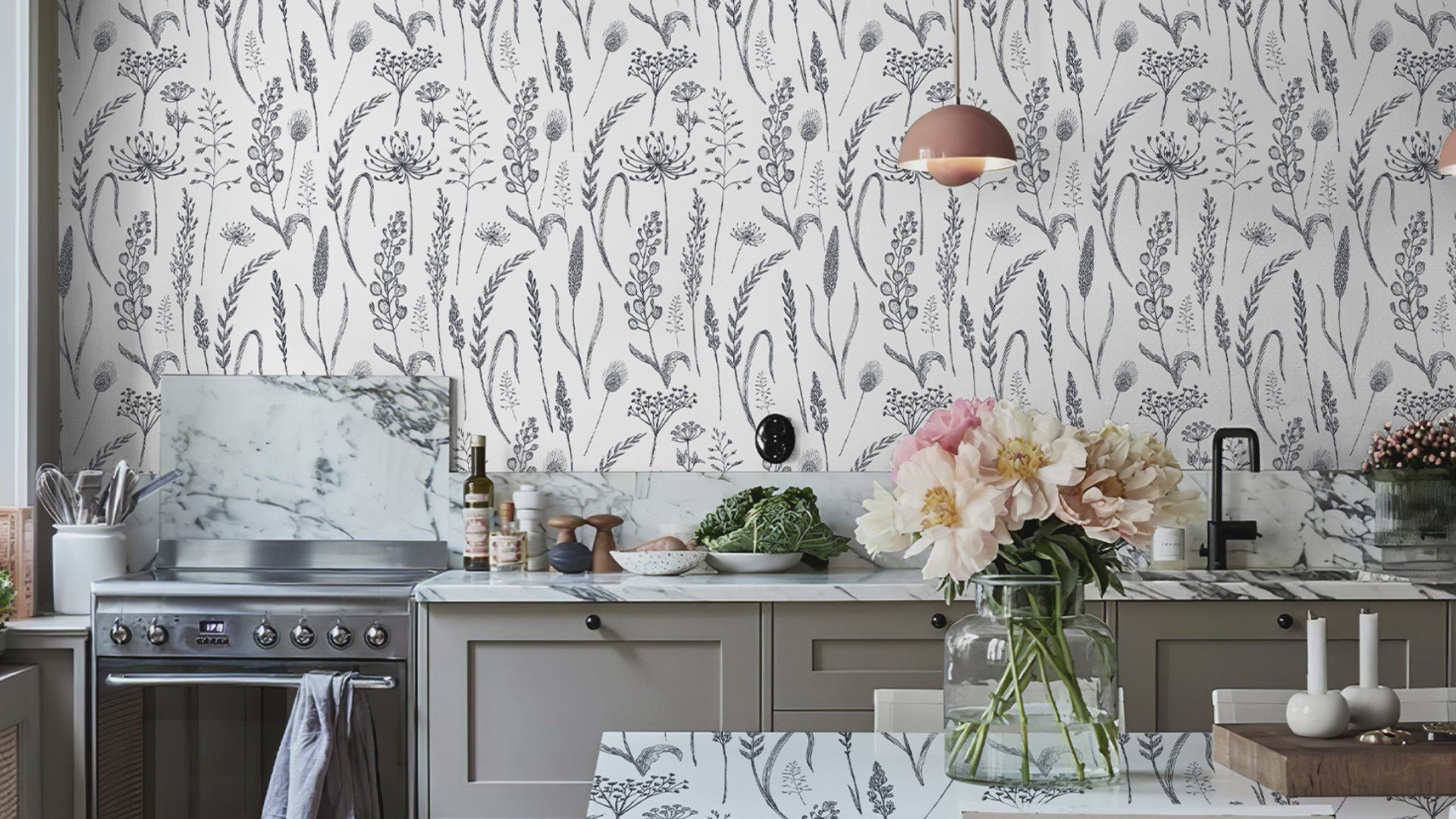 Create a calm, modern farmhouse retreat with this botanical wheat meadow peel and stick wallpaper. Delicate sketches of wild wheat and meadow florals climb across a soft background, bringing the look of hand-drawn botanical wallpaper to bedrooms, living rooms, hallways, and entryways. The neutral black and white palette keeps the design fresh and versatile, making it an easy match for cozy farmhouse, Scandinavian, or minimalist décor.